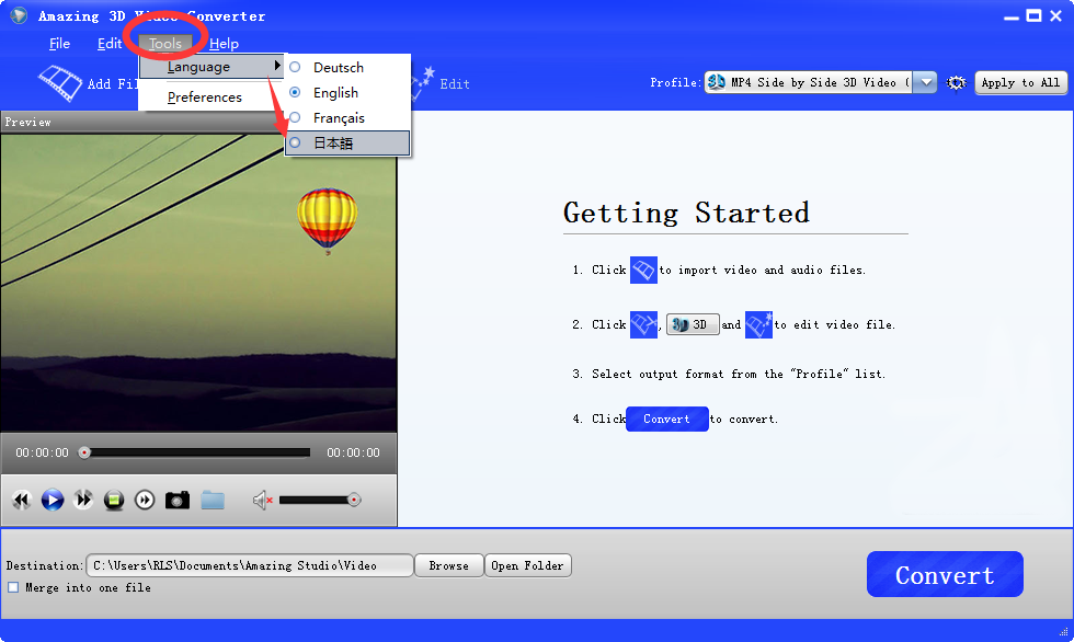 1 3Dビデオコンバータをインストールして実行します。 インターフェイス言語を選択します。